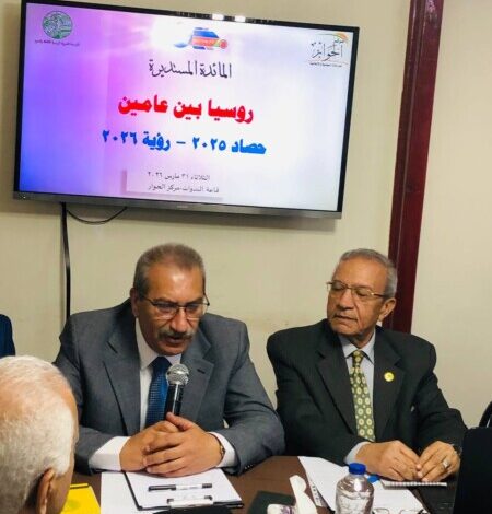 في إطار مناقشة أبرز ما جاء في استعراض العام مع فلاديمير بوتين لعام 2025 وهو لقاء سنوي يعقدة الرئيس بوتين مع الصحفيين والمواطنين الروس، يحمله في طياته دلالات مهمة على مختلف الأصعدة، نظم مركز الحوار للدراسات السياسية والإعلامية، بالتعاون مع المؤسسة المصرية الروسية للثقافة والعلوم ومركز الدراسات الاستراتيجية والتنبؤ السياسي(روسيا)، المائدة المستديرة بعنوان “روسيا بين عامين (حصاد 2025 – رؤية 2026)”. وجاءت الفعالية بهدف تحليل مضامين اللقاء السنوي للرئيس الروسي الذي عُقد في19 ديسمبر 2025، والذي استعرض خلاله أبرز إنجازات العام على المستويين الداخلي والخارجي، إلى جانب ملامح الرؤية الروسية لعام 2026.