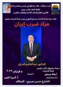 عن الضربة الأمريكية الجديدة لـإيران تستضيف نقابة إتحاد كتاب مصر الكاتب الصحفي الكبير دكتور عبد الحليم قنديل ..