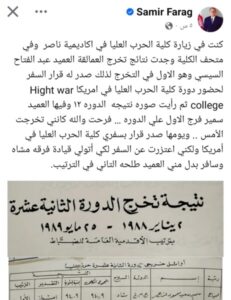 واستكمل سيادة اللواء منشوره واصفاً نتيجة التخرج بدفعة العمالقة والتي كان علي رأسها سيادة العميد عبد الفتاح السيسي وهو الأول في التخرج، والذي صدر له قرار السفر لحضور دورة كلية الحرب العليا في امريكا Hight war college ..